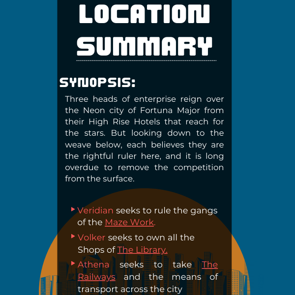 Three heads of enterprise reign over the Neon city of Fortuna Major from their High Rise Hotels that reach for the stars. But looking down to the weave below, each believes they are the rightful ruler here, and it is long overdue to remove the competition from the surface.